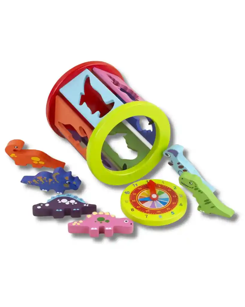 Este colorido set de dinosaurios está diseñado para estimular la inteligencia, la motricidad fina y el pensamiento lógico de los más pequeños mientras juegan. 📦 Incluye: - Caja cilíndrica de madera con figuras de dinosaurios y reloj didáctico - Piezas de diferentes formas para encajar y clasificar - Ilustraciones llamativas que capturan la atención infantil 🎯 Beneficios: - Desarrolla habilidades cognitivas y coordinación ojo-mano - Promueve el reconocimiento de formas y colores