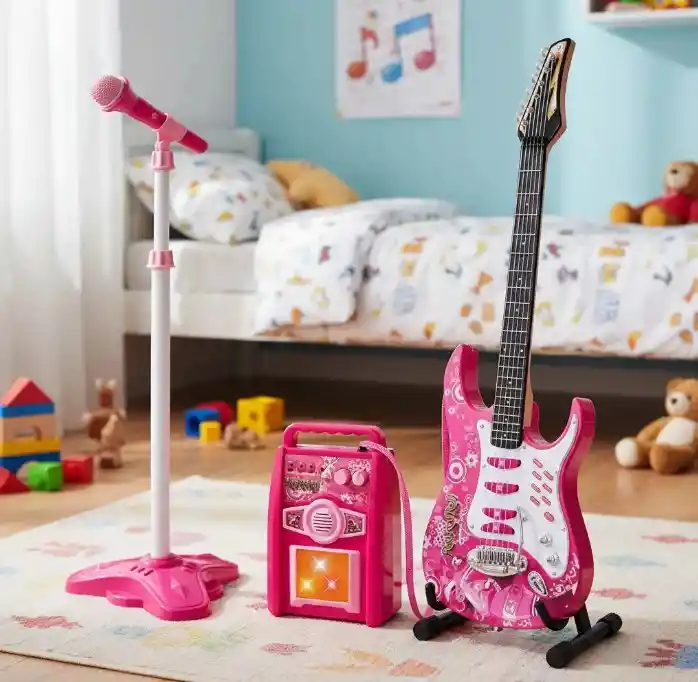 Juguete Guitarra Eléctrica Con Amplificador Micrófono Niñas Env Inmediato - CARACTERÍSTICAS PRINCIPALES - Juguete Guitarra Eléctrica Con Amplificador Micrófono Niñas - Características: - Desarrolla una creatividad y diversión a tus hijos, con esta sensacional guitarra que cuenta con amplificador y con 4 ritmos y 6 teclas. - Increíble set de guitarra eléctrica con amplificador y micrófono, todos con sonido de verdad, la guitarra genera sonidos al oprimir 2 cuerdas simultáneamente, en el amplificador controlas el volumen de la guitarra y el micrófono independientemente. El amplificador tiene entrada para mp3 por plug de 3,5mm La guitarra utiliza 4 pilas AA (no incluidas) - El amplificador utiliza 3 pilas AA (no incluidas) Tanto el amplificador como la guitarra tienen luces - El micrófono funciona de verdad Teclas de música 1-6 botones para la conversión de música diferente - Botón de demostración de música. Capaz de jugar continuamente seis canciones - Botón Detener - 2 modos - Cuatro luces intermitentes - Recomendar edad de 3 a 6 años - Altavoz - Perilla A para el interruptor de encendido y el control de volumen de la guitarra - Perilla B para el micrófono y el control de volumen MP3 - Jack de MP3, Jack de micrófono y Jack de guitarra - Altavoz 3 pilas AA (no incluidas) - Medidas Aproximadas - Medidas de Guitarra Alto 72 cm - Medidas de Micrófono de Pie Alto 1,05 cm - Medidas Altavoz 29 cm x 7,5 cm x 26,5 cm - Peso 8,9 kg.