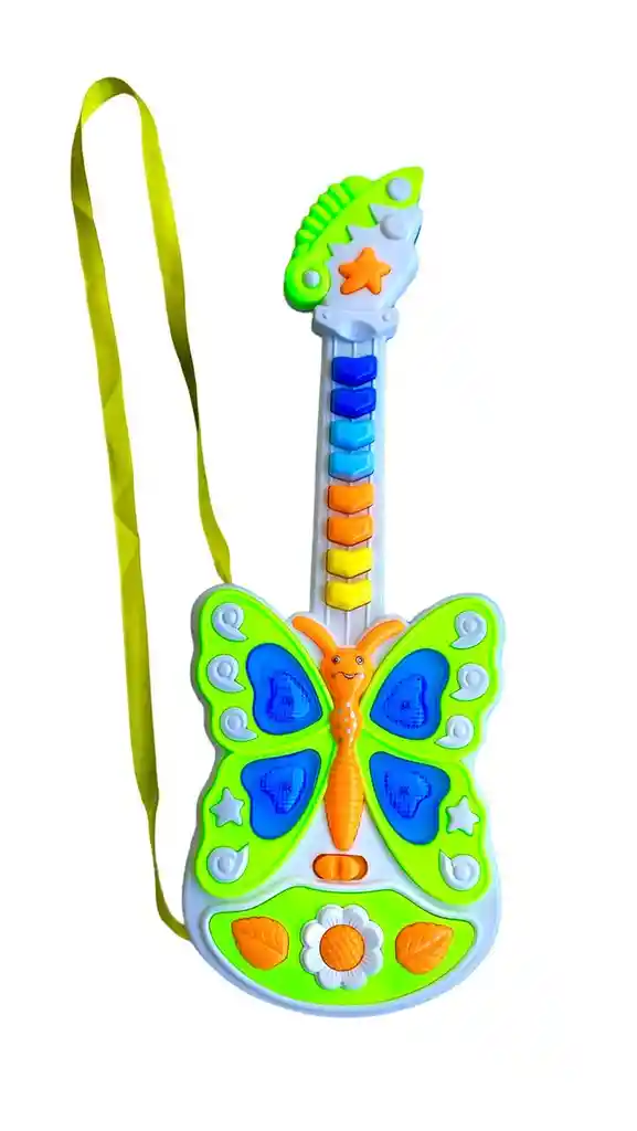 "Linda guitarra mariposa con luces y sonidos para que tu niña desarrolle su sentido auditivo. Se envía el color según disponibilidad. Características: 8 notas, Cada vez que tocas se enciende la luz. 3 botones de melodías, Incluye correa. Requiere 3 pilas AA no incluídas. Mide 43 cms"