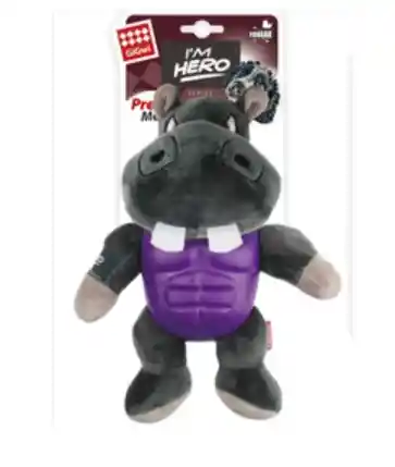 El Gigwi I'm Hero Hippo es un juguete interactivo para perros que combina la suavidad de un peluche con la resistencia de una armadura. Su diseño de hipopótamo cuenta con una coraza de caucho termoplástico (TPR) en el torso para protegerlo de las mordidas y texturas variadas que masajean las encías, mientras que sus extremidades de tela suave son ideales para que tu mascota lo cargue o sacuda. Es un juguete duradero y versátil, perfecto tanto para sesiones de juego intenso como para momentos de descanso y compañía.