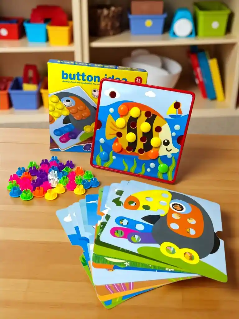 El juego educativo Button Idea es un set didáctico para niños mayores de 3 años que combina tableros ilustrados con botones plásticos de gran tamaño y colores llamativos. Su objetivo principal es estimular la coordinación mano-ojo, las habilidades motoras finas, el reconocimiento de colores y el pensamiento creativo, a través de la colocación de botones en los espacios correspondientes de las láminas ilustradas. 12 láminas ilustradas con diferentes escenas y personajes (animales, naturaleza, etc.) 46 botones de colores grandes y redondeados Base para fijar las láminas y colocar los botones Material: Plástico ABS no tóxico, libre de BPA Colores de los botones: Amarillo, rojo, verde, azul, naranja, púrpura, entre otros Presentación: Caja ilustrada con compartimentos internos para organizar piezas Características Botones grandes, ergonómicos y fáciles de encajar para niños pequeños. Láminas con huecos prediseñados que indican dónde colocar cada botón según el color. Colores vivos que atraen la atención y ayudan al reconocimiento cromático. Sistema de juego repetitivo que permite reutilizar las láminas múltiples veces. Seguro para niños: bordes redondeados y material resistente.