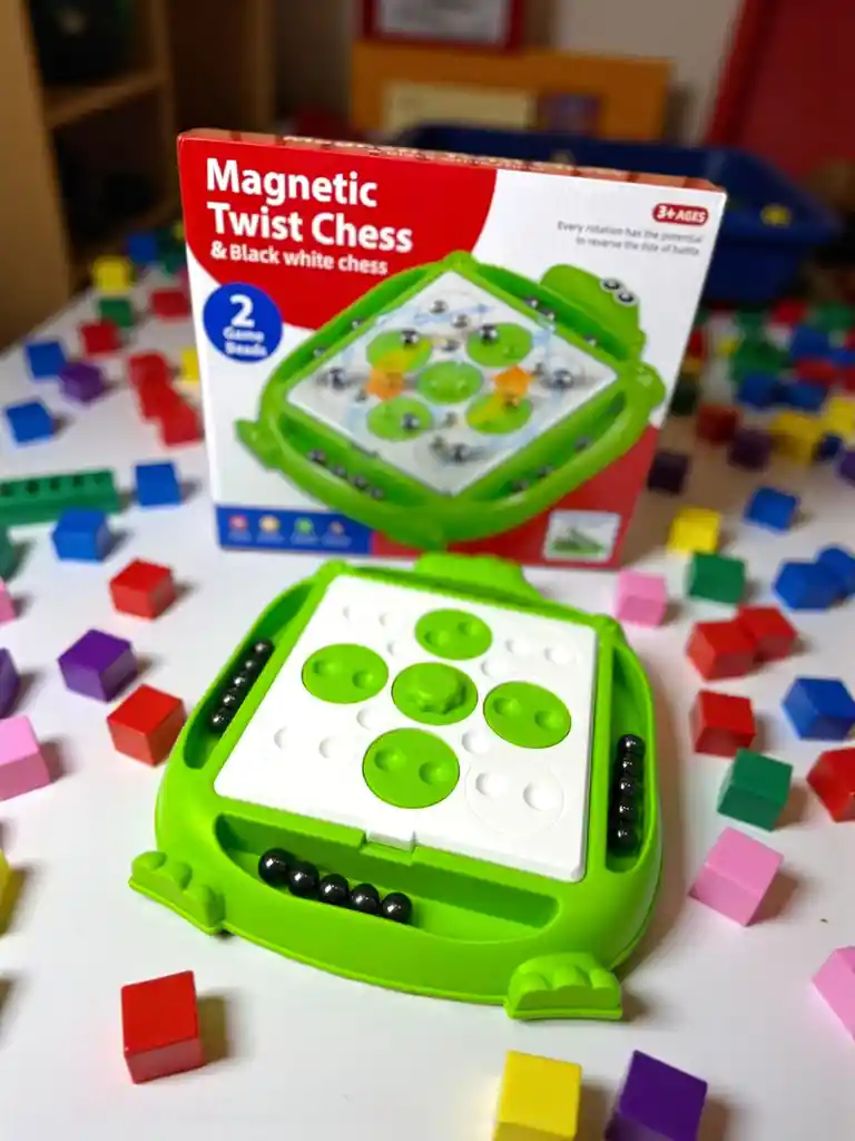 El Juego Magnético Dinosaurio – Magnetic Twist Chess es un tablero interactivo para niños mayores de 3 años, que combina elementos de estrategia con el uso de esferas magnéticas. El tablero tiene un diseño en forma de dinosaurio, lo que lo hace atractivo visualmente y más divertido para los pequeños. Su sistema de rotación permite cambiar la disposición de las piezas en cada turno, generando giros inesperados en el desarrollo del juego. Especificaciones Edad recomendada: 3 años en adelante Número de jugadores: 2 o más Tipo de juego: Juego magnético de estrategia Contenido del set: 1 tablero con diseño de dinosaurio 2 tipos de esferas magnéticas (beads) en colores contrastantes (negro y plateado) Compartimento interno para almacenar piezas Materiales: Plástico ABS resistente + imanes encapsulados Presentación: Caja ilustrada Características Tablero magnético con cavidades circulares para colocar las esferas. Sistema de rotación de secciones que cambia la dinámica de juego en cada movimiento. Compartimento interno para guardar todas las piezas al finalizar. Diseño colorido con forma de dinosaurio que estimula el interés de los niños. Piezas seguras y fáciles de manipular por manos pequeñas.