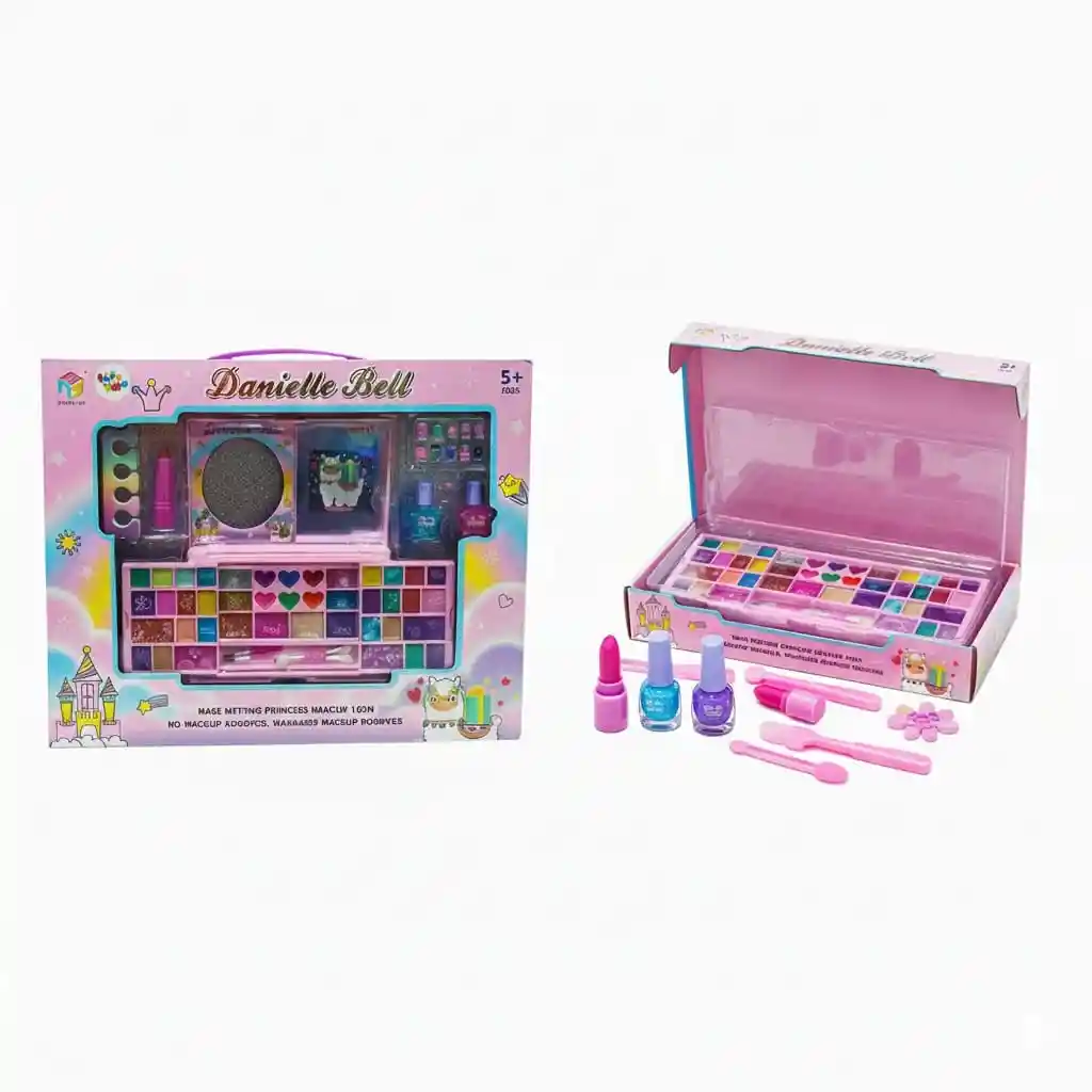 Este set de maquillaje es perfecto para las pequeñas amantes de la diversión y el estilo. Incluye una paleta de sombras de varios colores vibrantes y divertidas formas (como corazones), ideal para crear looks creativos y coloridos. Además, trae esmaltes de uñas en diferentes tonos, perfectos para decorar y darle brillo a las manos. También contiene varios brillos y labiales en un delicado tono rosa para que las niñas puedan experimentar con el maquillaje de manera segura. El kit incluye separadores para los dedos de los pies, facilitando la aplicación del esmalte y evitando que se pegue mientras seca. Viene con aplicadores y un espejo compacto para que los niños jueguen y se diviertan como pequeñas princesas. Apto para niñas de 5 años en adelante.