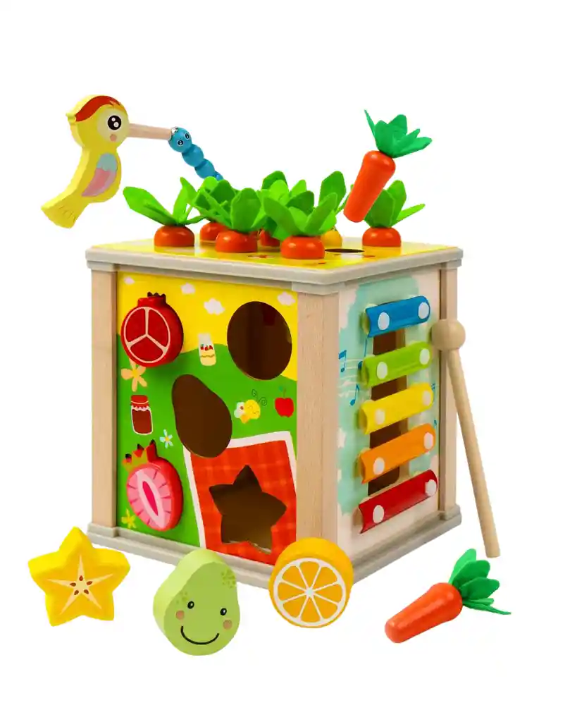Este juguete educativo de madera combina múltiples actividades que estimulan el desarrollo integral de los niños pequeños. Ideal para edades de 1 a 4 años, cada lado ofrece una experiencia única que fomenta la exploración, la coordinación y el juego simbólico. ✨ Características Destacadas • 🥕 Huerto de Zanahorias y Caza de Gusanos Actividad de “plantar y cosechar” zanahorias de fieltro y atrapar gusanos con el pajarito, perfecta para fortalecer la motricidad fina y la coordinación ojo-mano. • 🎶 Xilófono Musical con Baqueta Introduce el ritmo, la creatividad sonora y la exploración musical de forma divertida y segura. • 🔷 Clasificador de Formas y Alimentos Incluye figuras como estrella, círculo, aguacate, zanahoria y limón para estimular el reconocimiento de formas, colores y alimentos saludables.