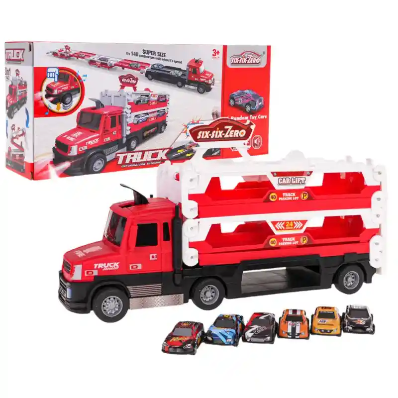 Mula interactiva de tres niveles con catapulta para niños a partir de 3 años. La Mula tiene ruedas con neumáticos de goma que le proporcionan una excelente tracción. El juguete cuenta con tres niveles donde se pueden guardar numerosos coches (el set incluye seis coches con carrocería metálica). Al desplegar los niveles, se crea una pista para coches de hasta 140 cm de largo. El camión incorpora una catapulta: basta con colocar el coche en el nivel inferior y presionar la palanca situada en el techo. El coche saldrá disparado hacia adelante y recorrerá la pista desplegable. El juguete funciona con 2 pilas AA de 1,5 V (no incluidas). Al presionar la parte delantera del camión, se activan efectos de sonido (motor y frenos) y luces intermitentes (faros delanteros).