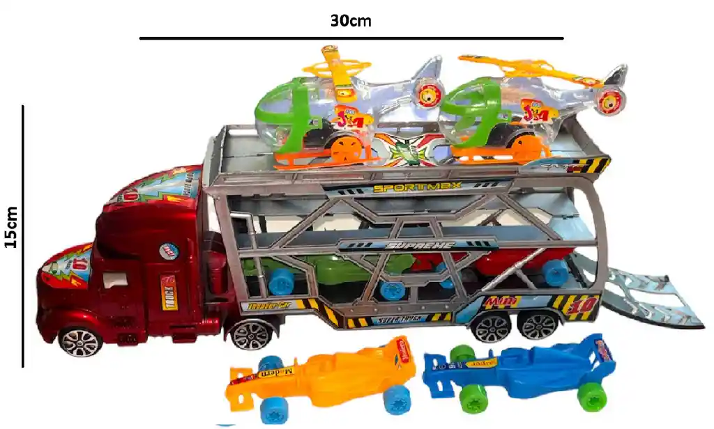 Mula truck Con 4 Carros Y 2 Helicopteros Ref 168-1 Medidas de la mula 30cm ancho x 15cm de alto.