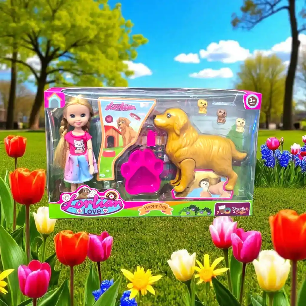 incluye una muñeca y un perro de juguete, probablemente un Golden Retriever, junto con accesorios como una huella de pata rosa que podría ser un plato para comida, y pequeños cachorros de perro. Nombre del producto: Set de Muñeca y Perro "Lorlian Love - Happy Day". Contenido: Incluye una muñeca rubia, un perro de juguete grande, pequeños cachorros, y accesorios como un plato con forma de huella de pata.