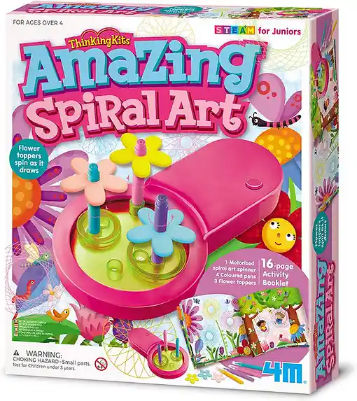 Empaque de regalo sin costo adicional, escríbenos al finalizar la compra. 4 años + Los espirales de flores giran mientras se dibuja una pieza de arte motorizada. El libro de actividades de 16 páginas a todo color está repleto de coloridos fondos alegres con áreas delineadas para usar como guía para completar las creaciones con un giro único con la ayuda del Espiral Motorizados STEAM. Ajusta la altura de los toppers de flores, inserta los bolígrafos en agujeros alternos y juega con las combinaciones de colores. Cada combinación única hará un patrón diferente. Después de dominar el Spinner de arte en espiral, use su imaginación y su patrón favorito para crear marcadores, tarjetas de felicitación o marcos de fotos. El libro de actividades contiene cuatro páginas cuadriculadas de alta calidad para comenzar su propio diseño original. Deja volar tu imaginación mientras experimentas. EL KIT INCLUYE: espiral giratoria motorizada, bolígrafos de colores (rosa, azul, turquesa y amarillo), adornos de flores (3). NO INCLUYE: destornillador pequeño y dos (2) baterías AA (1,5 voltios).