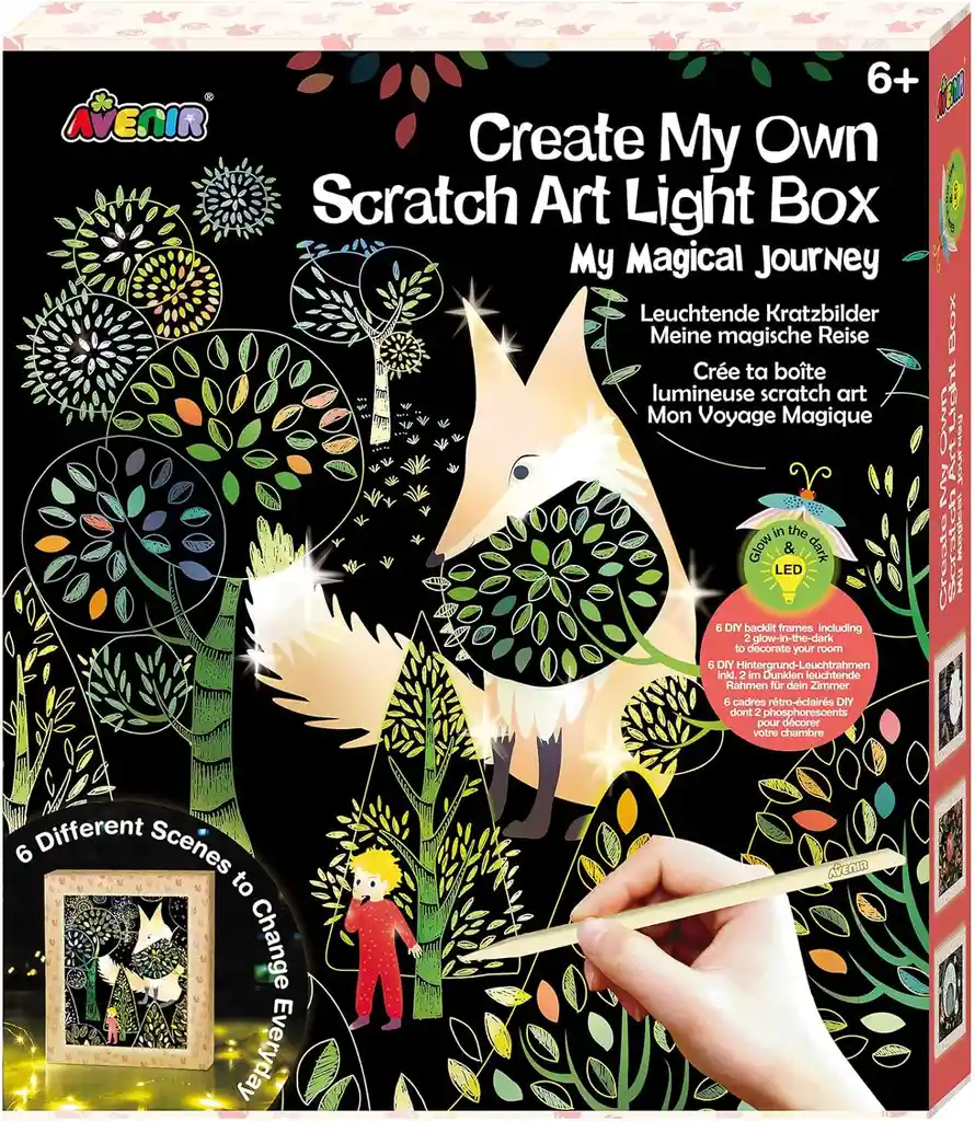 Empaque de regalo y tarjeta sin costo adicional, escríbenos al finalizar la compra. 6 años+ ¡Dale vida a tu habitación con una hermosa caja de luz diseñada a mano que te transportará a 8 escenas diferentes! Sea cual sea tu estilo, esta caja te permite expresar tu creatividad y singularidad. Convierte la caja en el marco perfecto para tu caja de luz y elige entre 8 cautivadoras escenas. Además, incluye luces de hadas para iluminar tu creación de scratch y agregar un toque de magia a tu espacio personal. ¡Sé único y deja volar tu imaginación con nuestra exclusiva caja de luz! Tamaño: 27 x 24 x 4cm