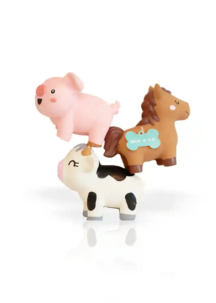 Set de Juguetes de Granja - Piggy, Pony & Cow. ¡Diversión al estilo rural! Este adorable set de juguetes de látex natural es perfecto para juegos de buscar y morder. Suaves, resistentes y con sonido para mantener entretenido a tu peludo con gran estilo campestre. Ideal para perros curiosos y juguetones.