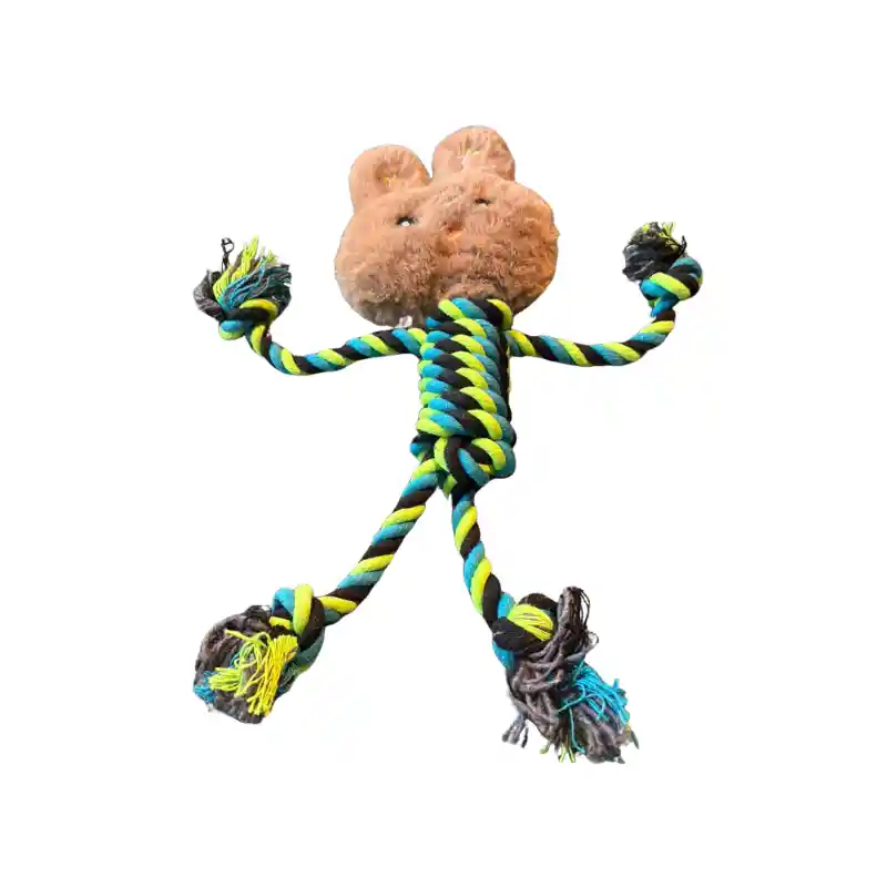 Divertido y resistente juguete para perros tipo lazo con peluche, diseñado para ofrecer entretenimiento y estimular el instinto natural de morder y jugar. Cuenta con una cabeza de peluche en forma de conejo, suave y atractiva para la mascota, mientras que el resto del cuerpo (tronco, patas y brazos) está elaborado en lazo trenzado, ideal para juegos de halar, morder y sacudir. Gracias a su combinación de materiales, este juguete ayuda a promover la higiene dental, mientras mantiene al perro activo y entretenido. ✨ Características: Diseño con cabeza de conejo en peluche Cuerpo en lazo trenzado resistente Ideal para juegos de halar, morder y sacudir Ayuda a la limpieza dental Estimula la actividad física y el entretenimiento 📏 Medida aproximada: Largo: 30 cm Perfecto para perros que disfrutan juguetes interactivos y resistentes para jugar solos o en compañía.