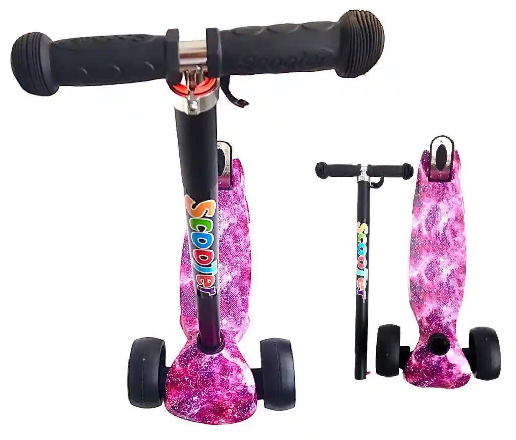 Patineta Monopatin Scooter para que las más pequeñas de la casa se diviertan en el parque. Viene con 4 ruedas que le brindan un mejor soporte y estabilidad. Freno trasero de fácil uso. Luces led en sus lindas ruedas. Su altura es graduable. Es duradero, y súper divertido.