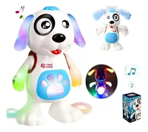 Este precioso perrito le enseñara los mejores pasos de baile a tus pequeños. ¡Regala diversion! Medidas: 21cm x 9.5 cm x 14 cm Bateria: 3 AA Mueve las orejas, los brazos y camina. Tiene luces y sonido.