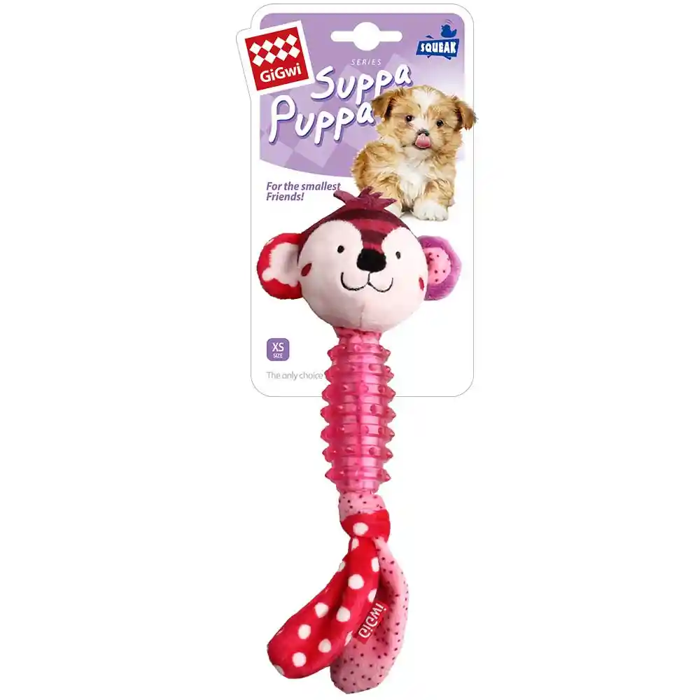 El juguete GiGwi Suppa Puppa en talla XS es el compañero ideal diseñado específicamente para cachorros y perros de razas pequeñas. Este divertido mono combina texturas de peluche suave con un cuerpo de caucho termoplástico (TPR) con relieve, perfecto para masajear las encías y aliviar la molestia dental de los más pequeños mientras muerden. Además, incluye un sonajero interno (squeaker) que estimula el juego y colas de tela flexibles que facilitan el agarre y el forcejeo, garantizando horas de entretenimiento seguro y duradero.