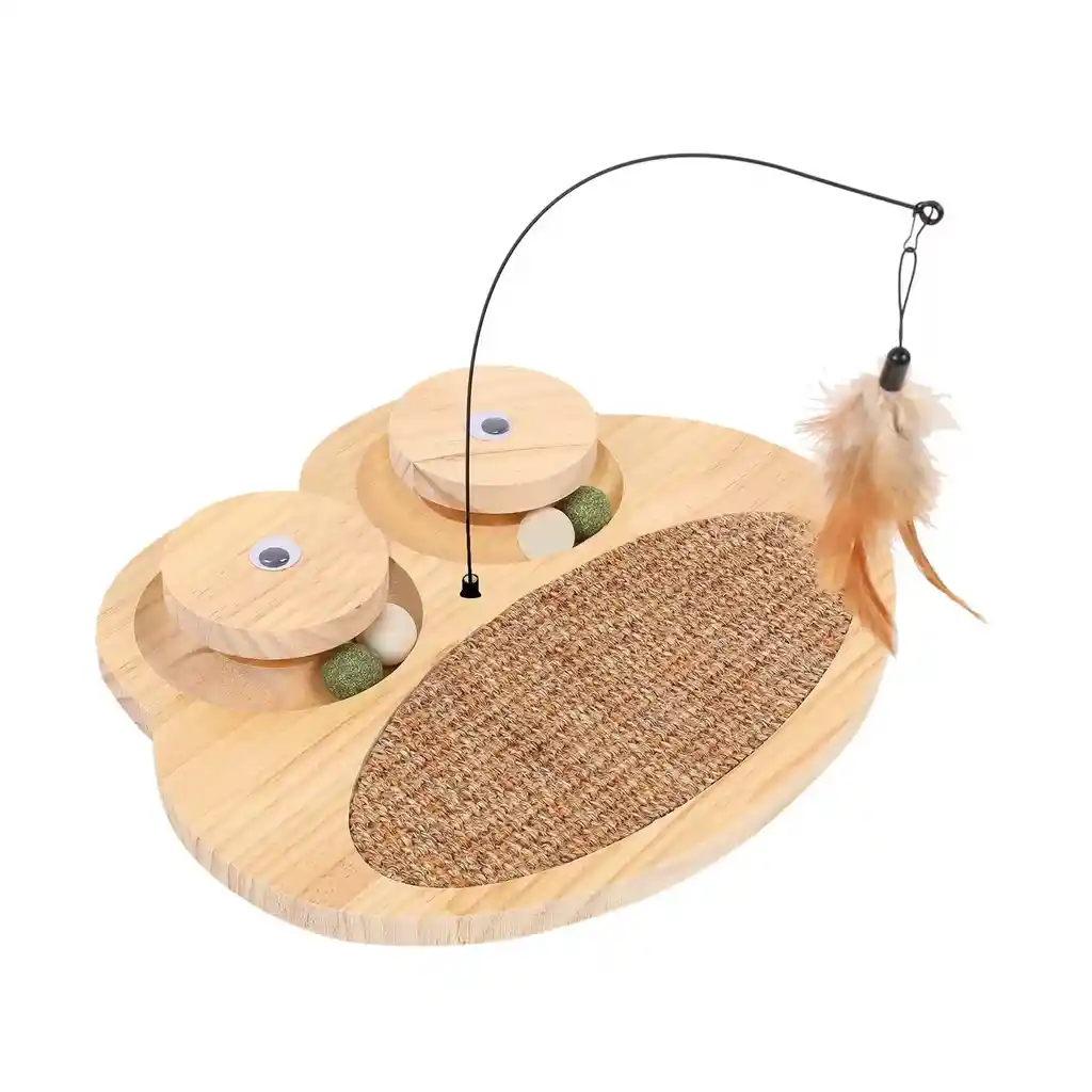 Juego interactivo para gatos elaborado en madera natural, diseñado para estimular el instinto de caza, el movimiento y la curiosidad felina. Incorpora compartimentos con pelotas móviles que retan su agilidad mental, una superficie de rascado en fibra resistente para el cuidado de sus uñas y una varilla flexible con plumas que invita al juego activo