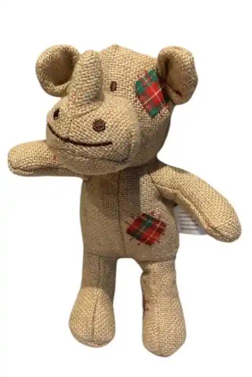 Rinoceronte en peluche de la más alta calidad, pito interno en pancita, resistente para nuestros peluditos, en fique. Medidas aproximadas: 30 cm de alto y 16 cm de ancho.