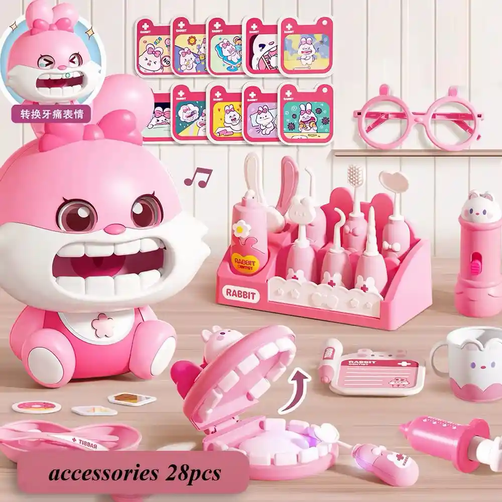 Este es un set de juego de dentista de juguete con temática de conejo, diseñado para ayudar a los niños a desarrollar buenos hábitos de cepillado. Estilo: Conejo dentista (31 piezas). Función: Transforma la higiene dental en una experiencia divertida y atractiva para los niños. Contenido: Incluye varios accesorios médicos de juguete como una caja médica, jeringa, gafas, cepillos de dientes y una dentadura. Uso: Perfecto para cumpleaños, festivales o vacaciones.