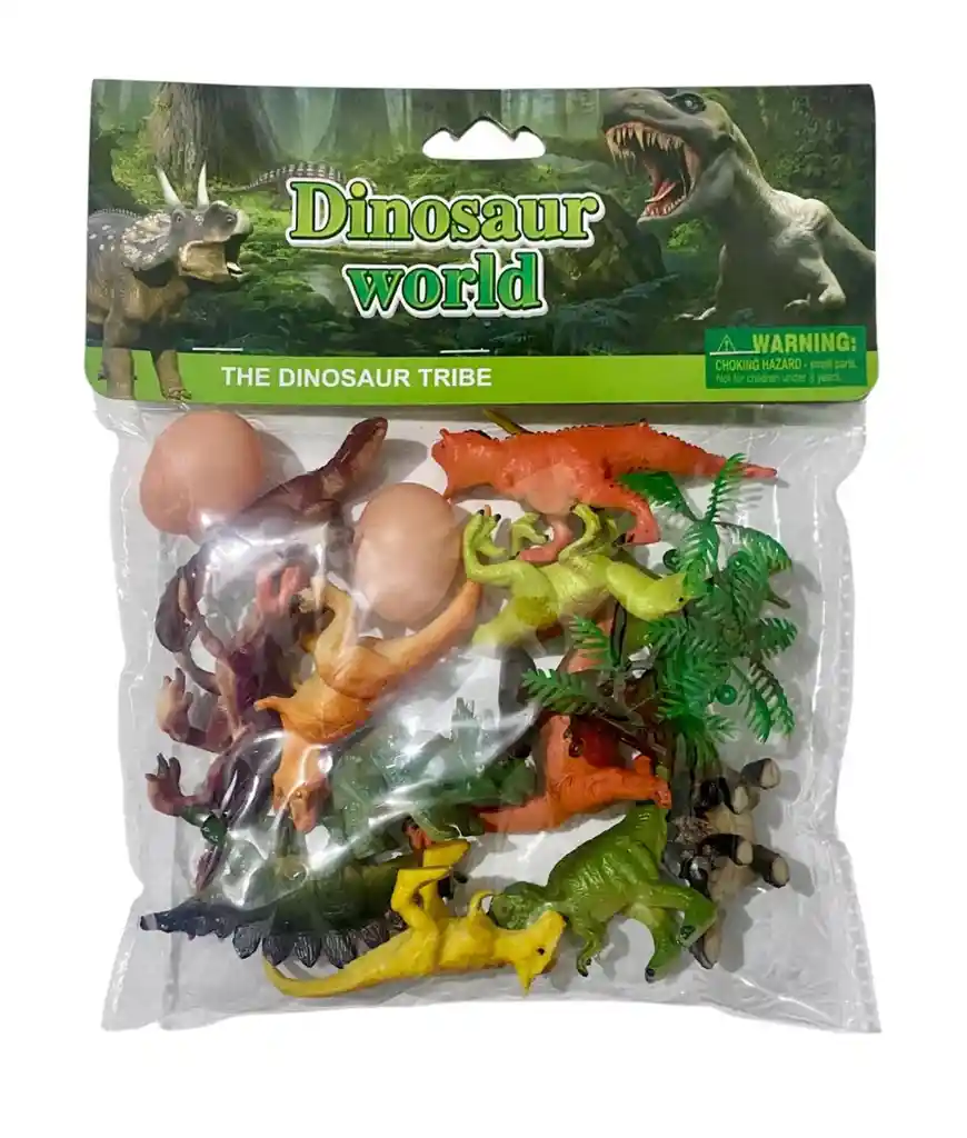 Bolsa de Dinosaurios x 16 piezas. Incluye 12 dinosaurios con medidas aproximadas de 8cm largo, 2 huevos y 2 palmeras. Material de plástico Resistente. Para niños mayores de 3 años.