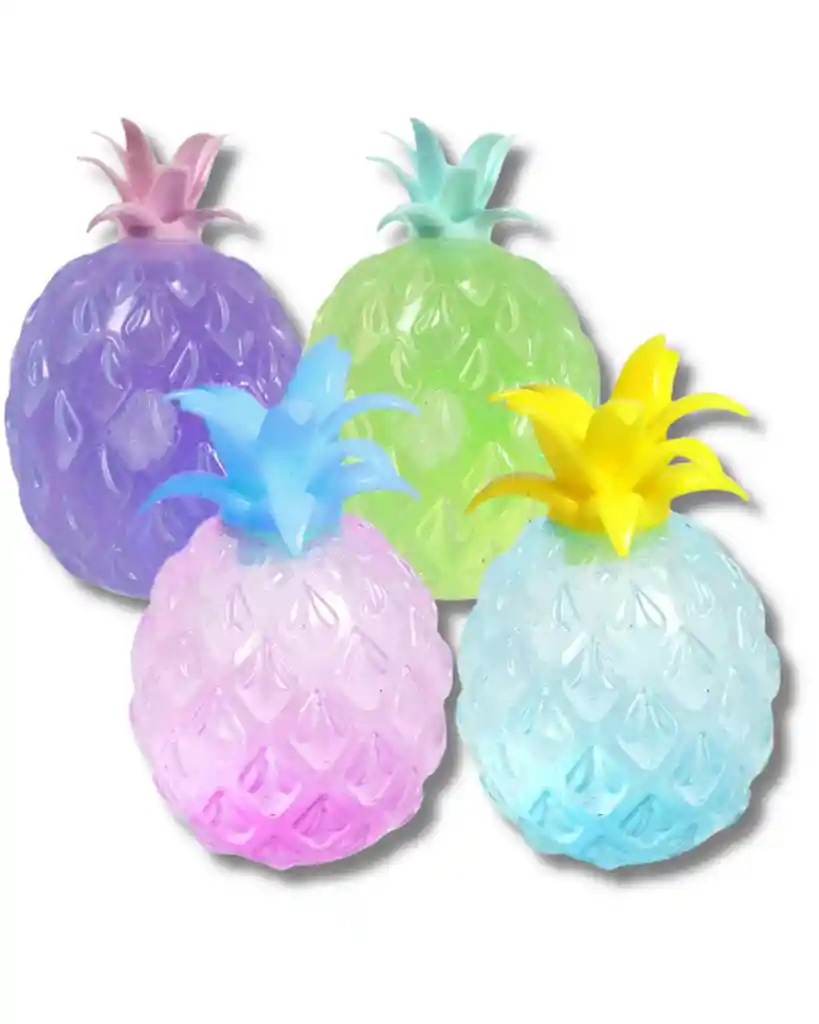 Squishy en forma de piña, suave y elástico. Perfecto para aliviar el estrés, ansiedad o simplemente divertirse. Su textura es agradable y recupera su forma después de apretarlo. Características principales: Material: goma/gel suave y flexible. Tamaño: compacto, ideal para llevar en la mano o en el bolso. Colores llamativos, incluye brillo en su interior. Presentación en caja transparente de regalo.