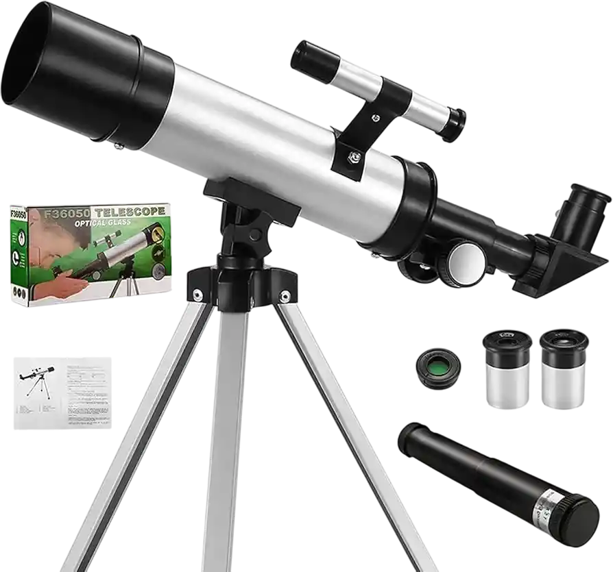 Telescopio de refracción astronómica F36050 con trípode. Es un telescopio DIDACTICO para principiantes, si buscas uno profesional debes tener en cuenta otras opciones que cumplan con esas expectativas (el precio de uno profesional es mucho mayor), no aceptes imitaciones. Principales características: - Un telescopio pequeño de tipo refractante con un diámetro mayor (50 mm), que representa un pequeño lugar - Puede configurar 60X, 18X, el grupo espejo más 1.5X, 90X, 27X - Equipado con dos oculares de aumento diferentes y espejos multiplicadores de 1.5X, para que pueda mezclar libremente, observar diferentes distancias y tamaños de objetos - Apto para principiantes entusiastas de la astronomía, especialmente el mejor regalo para sus hijos AMPLÍE SUS HORIZONTES con el Kit de Telescopio de 50 mm para niños y adultos. Este telescopio principiante todo incluido es perfecto para los observadores de aves en ciernes y los observadores de estrellas. EL JUEGO DE 4 PIEZAS incluye un trípode de tamaño completo con instrucciones; H6mm, H20mm, 3 veces el espejo Barlow Resolución teórica: 2.800 segundos de arco, que es equivalente a dos objetos a una distancia de 1.357 cm a 1000 metros.