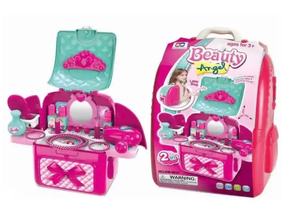 Estuche de belleza para niñas tipo morral. Un lindo y exclusivo juguete para las princesas de la casa. Gracias a su diseño tipo morral, puedes llevarlo a cualquier lugar, garantizando el orden y el cuidado de sus accesorios. El set incluye: Espejo, cepillo, secador, collares, pulseras, perfume, labiales y más. Material: Plástico no tóxico y resistente. DIMENSIONES: 39,5x21,5x40 cm.
