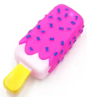 Este divertido juguete para perros con forma de paleta helada es el accesorio ideal para llenar de color y alegría las sesiones de juego de tu mascota. Su diseño vibrante en tonos rosa, blanco y amarillo destaca por una textura de pequeños huesos azules en relieve que masajean las encías y facilitan el agarre durante la masticación. Fabricado con materiales resistentes y suaves, es perfecto para perros de razas pequeñas o medianas que buscan un juguete ligero, llamativo y fácil de cargar.