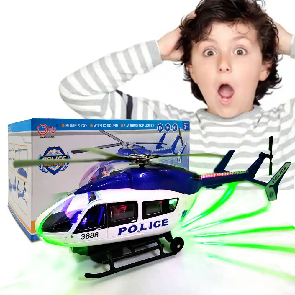 HELICOPTERO POLICE LUCES Y SONIDO Increible replica de un helicoptero de ayuda umanitaria con el que tu pequeño no parara de divertirse creando todo un mundo de fantacia mientras juega. Solo enciendelo y deja que sus helices comiencen a girar. y si lo pones en el suelo tambien girara gracias a su rueda universal. Medidas Helicoptero: 37 cm de Largo x 12.5 cm de Alto. Medidas Empaque: 11 cm de Alto x 22.5 cm de Largo x 10 cm de Ancho. Los juguetes siempre han desempeñado un papel importante en la vida de los niños, siempre considerando los gustos y deseos de los más pequeños de la casa y no tan pequeños, procurando dar la mejor de las sorpresas y ganarse esa sonrisa incomparable que los llena de felicidad. Juguetes, cuentos, y cualquier producto orientado a la satisfacción y desarrollo de los niños. Diversión, entretenimiento y aprendizaje.