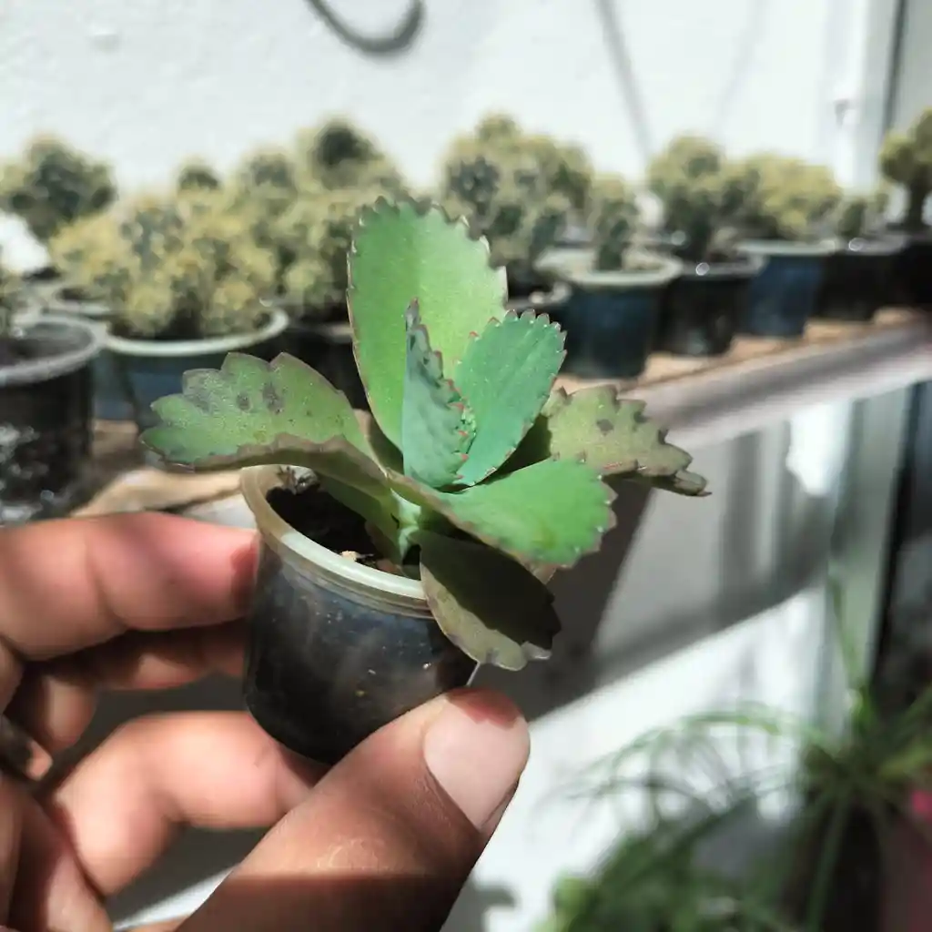 La Kalanchoe daigremontiana es una planta suculenta originaria de Madagascar, caracterizada por sus hojas carnosas y dentadas, de color verde oscuro en el haz y púrpura en el envés. Una de sus características más distintivas es su capacidad para producir pequeñas plantulas a lo largo de los márgenes de sus hojas, las cuales se desprenden fácilmente y enraízan al tocar el suelo, de ahí su apodo de «mala madre». Puede alcanzar alturas de hasta un metro.