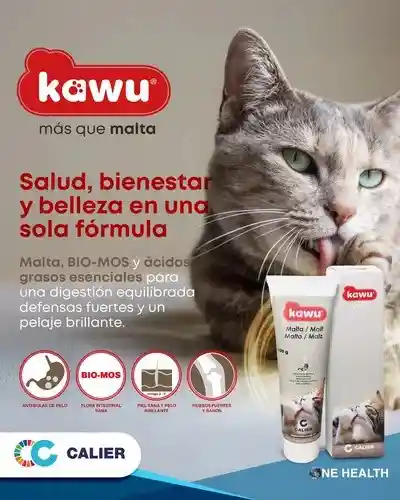 Kawu Malta 100gr es un complemento nutricional en pasta diseñado principalmente para gatos, fabricado por el laboratorio Calier. Su función principal es prevenir la formación de bolas de pelo (tricobezoares) en el sistema digestivo y facilitar su eliminación natural.