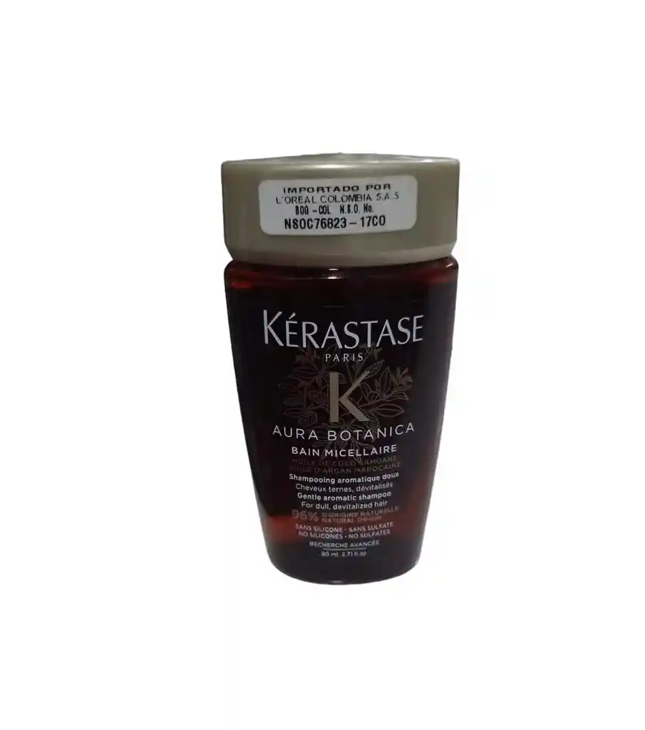 Kerastase Aura Botanica Bain Micellaire Shampoo 80ml Baño suave aromático con aceites de coco y argán que se transforman en una lujosa espuma, limpiando todas las impurezas. Debe usarse siempre con el Soin Fondamental. BENEFICIOS 1. 48 horas de nutrición profunda 2. 72 horas anti-encrespamiento 3. Cabello tres veces más brillante 4. 97% de ingredientes de origen natural 5. Sin sulfatos ni siliconas 6. Limpieza suave 7. Aromático APLICACIÓN Aplicar el baño en el cabello húmedo, masajear bien para liberar su rica espuma y su fragancia aromática. Aclarar bien. Aplicar dos veces antes de usar el Soin Fondamental.