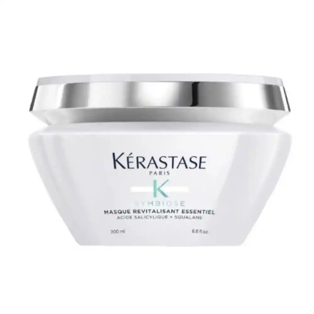 Symbiose Masque Revitalisant Essentiel de Kérastase es una mascarilla revitalizante intensa sin sulfatos para cabello sensibilizado, con tendencia a la caspa y escualano para el cuidado intenso de la fibra. Una fórmula ultra cuidada, diseñada específicamente para personas con caspa y con la fibra capilar sensibilizada. Calma las molestias, ayuda a eliminar los residuos atrapados en los largos con su fuerte acción desenredante, repone la humedad de la fibra y aporta una intensa nutrición a la fibra capilar. La Masque Revitalisant Essentiel tiene una rica textura sensorial blanca cremosa combinada con una lujosa fragancia fina.
