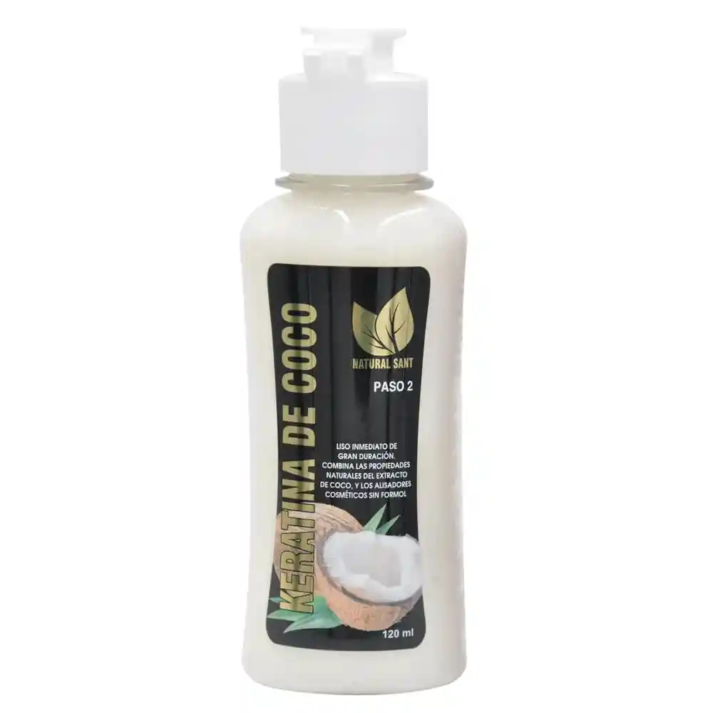 KERATINA DE COCO NATURAL SANT 120 ML : aporta un alisado inmediato hasta por 6 meses, contiene shampoo, keratina y tratamiento de mantenimiento. Su extracto contribuye al manejo del cabello seco y aporta brillo. LIBRE DE FORMOL.Brinda hidratación, brillo y sedosidad, recuperando el cabello maltratado. Además alisa hasta un 95% y dura entre 4 y 6 meses aproximadamente. (Ideal para cabello seco). La duo Caja Incluye: - 1 shampoo de coco 120ml - 1 Keratina de coco 120ml - 2 sobres de tratamiento de coco x 15ml para mantenimiento. Este tamaño alcanza para 1 o 2 aplicaciones. Puedes aplicarla en casa. Beneficios Nuestro duo caja de keratina de coco es un producto diseñado para el alisado inmediato del cabello, combina las propiedades naturales del extracto de coco y los alisadores cosméticos sin formol. Brinda hidratación, brillo y sedosidad, recuperando el cabello maltratado. Además alisa hasta un 95% y dura entre 4 y 6 meses aproximadamente. (Ideal para cabello seco). La duo Caja Incluye: - 1 shampoo de coco 120ml - 1 Keratina de coco 120ml - 2 sobres de tratamiento de coco x 15ml para mantenimiento. Este tamaño alcanza para 1 o 2 aplicaciones. Puedes aplicarla en casa. Modo de uso 1. Lava tu cabello con SHAMPOO CON ACEITE DE COCO Y KERATINA de Natural Sant en una o dos ocasiones hasta que quede limpio y libre de grasa, sin aplicar acondicionador. 2. Secar un 90% el cabello con secador para retirar la humedad. 3. Separarlo por mechones con una pinza plana y aplicar la SHAMPOO CON ACEITE DE COCO Y KERATINA de Natural Sant en cada uno de ellos. 4. Dejar actuar de 40 minutos a 1 hora. 5.Comienza a planchar el cabello desde la raíz hasta las puntas, mínimo 6 veces, haciendo énfasis en las zonas con mayor cantidad de ondas no deseadas. Asegúrate de utilizar una plancha que proporcione el calor adecuado para potenciar las propiedades del producto. Se recomienda una temperatura de 450°F o 230°C. 6. Después de terminar el planchado, puedes retirarlo con shampoo y tratamiento de cebolla, romero y biotina, recomendamos retirarlo el mismo día. 7. Finalmente, con el secador, oreas el cabello. Recomendaciones: 1. Continuar utilizando el TRATAMIENTO PULPA DE COCO para mantenimiento después de cada shampoo en pequeñas cantidades 2. El cabello no puede tener decoloración de menos de 2 semanas, si aún no cumples las dos semanas se recomienda hidratar a profundidad los días antes de la aplicación. 3. Continuar oreando el cabello con secador al menos por 1 semana posterior a la aplicación. 4. Si quieres aplicar tintura debes hacerlo después de 3 lavadas. 5. No se recomienda para mujeres embarazadas ni en lactancia menor a 6 meses. 6. La keratina es para mayores de 14 años. Ingredientes cocos nucifera OIL, Mineral Oil White, Hidrolyzed Keratin, Collágen, Glyoxylic Acid, Glyoxylic acid (and) water (and) pentylene glycol, Citric Acid, Dimethiconol (and)TEA dodecylbenzenesulfonate, Cyclopentasiloxane, (Cetrimonium Chloride (and) Cetyl Alcohol (and) Stearyl Alcohol), DMDM Hydantoin (and) Iodopropynyl Butylcarbamate (and) Butylene Glycol (and) Water, Fragrance and Water.
