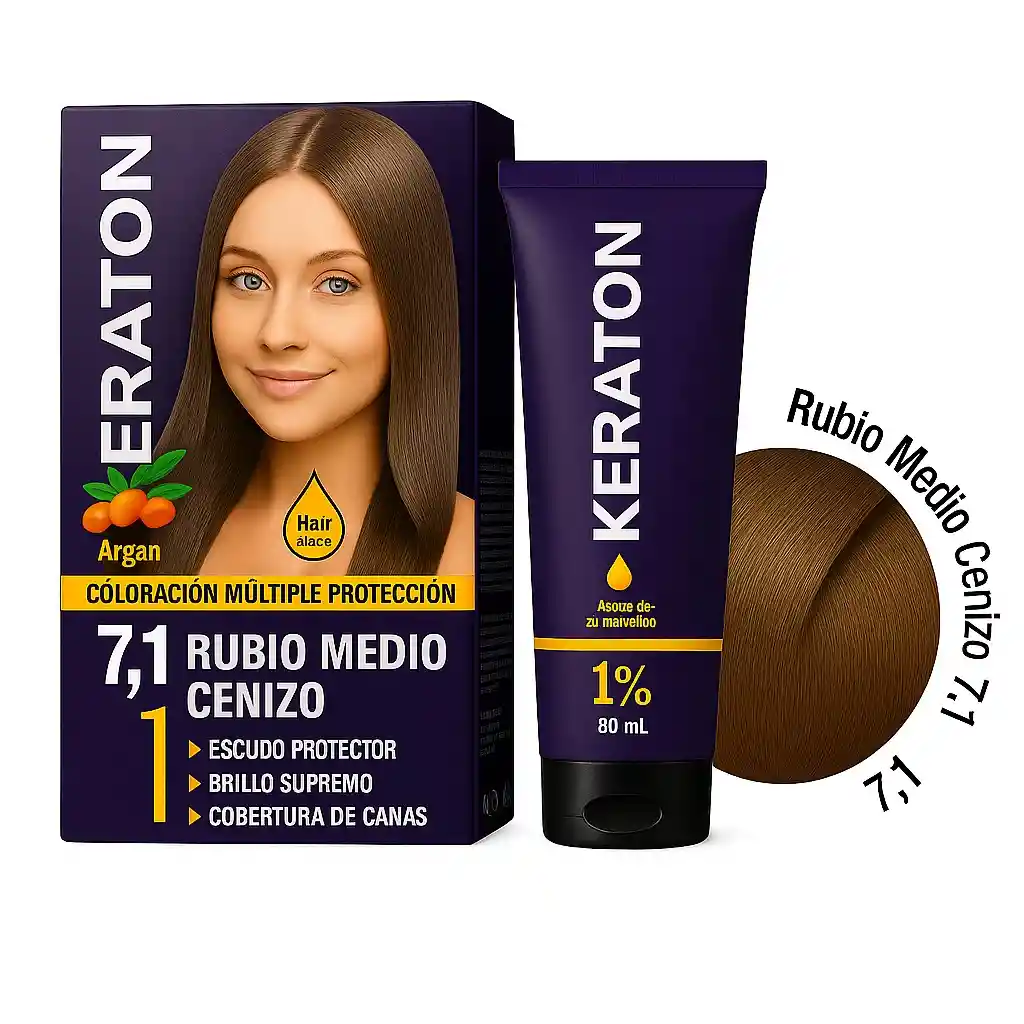 Descripción del tono Tono: 7.1 Rubio Medio Cenizo Reflejo: Frío y ahumado (cenizo), ayuda a eliminar los reflejos naranjas o amarillos no deseados. Nivel de altura: Intermedio (ni claro ni oscuro). 💧 Características principales Marca: Keraton (marca brasileña reconocida por sus tintes con queratina y aminoácidos). Fórmula: Contiene queratina, argán y miel, que ayudan a proteger y nutrir el cabello durante el proceso de coloración. Textura: Suave y cremosa, fácil de aplicar. Duración: Permanente, con cobertura total de canas. Amoníaco: En algunos formatos, sin amoníaco (revisar versión del producto). ✨ Beneficios Brinda un acabado natural y brillante, sin reflejos rojizos. Neutraliza tonos cálidos en bases rubias, castañas claras o previamente decoloradas. Aporta suavidad, hidratación y reparación capilar gracias a sus ingredientes activos. Ideal para mantener un rubio frío y elegante. 🧴 Modo de uso Mezcla el tinte (1 parte) con el revelador de 20 volúmenes (1 parte). Aplica sobre el cabello seco y sin lavar. Deja actuar entre 30 y 40 minutos según el tono deseado. Enjuaga y aplica un tratamiento o mascarilla hidratante. 💡 Recomendaciones Para mantener el tono cenizo, utiliza shampoo violeta o matizante una o dos veces por semana. No se recomienda aplicar sobre cabello muy oscuro sin decolorar previamente. Hidratar el cabello antes y después del proceso para evitar resequedad.