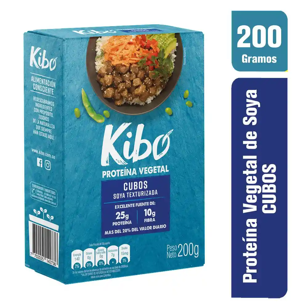 Kibo. alimento de soya en cubos texturizada que contiene 25 gramos de proteina vegetal y 10 gramos de fibra.