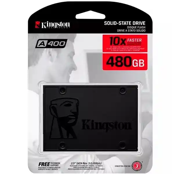 disco de estado sólido A400 de Kingston mejora la capacidad de respuesta de su sistema existente con velocidades increíbles de inicio, carga y transferencia. Usa un controlador de última generación para leer y escribir a velocidades de hasta 500MB/seg y 450MB/seg