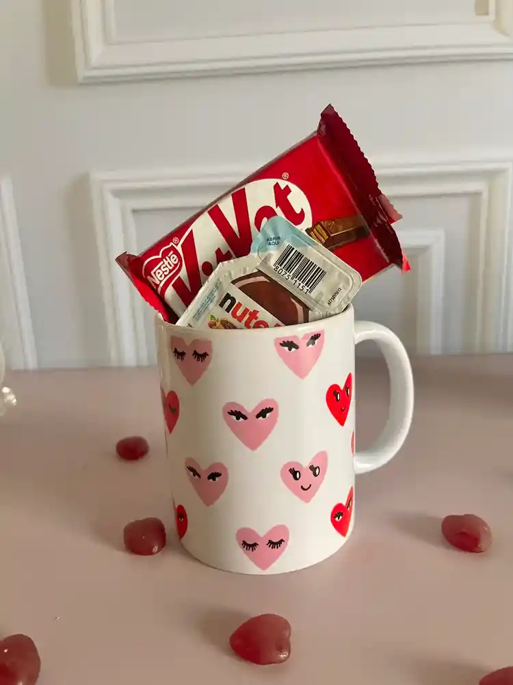 -bolsita celofán -1 Mug de corazones rosado y rojo con ocasión de amor -1 kit kat -1 nutella mini