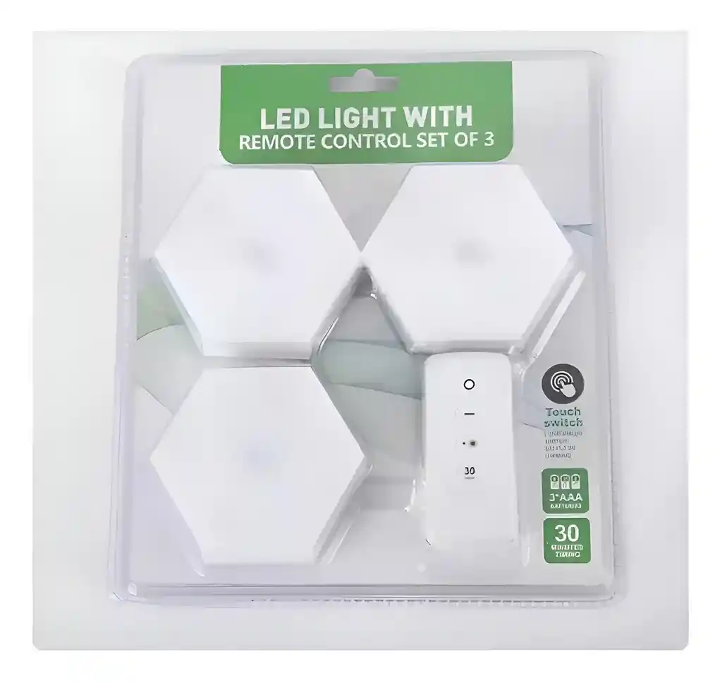 Ilumina cualquier rincón de tu hogar de forma práctica y moderna con este kit de tres lámparas LED hexagonales, diseñadas para ofrecer una solución de iluminación inalámbrica y versátil. Gracias a su diseño modular y ligero, puedes instalarlas fácilmente en armarios, cocinas o pasillos sin necesidad de cableado, utilizando simplemente cinta adhesiva de doble cara. El sistema permite un control total mediante un mando a distancia que incluye funciones de encendido, apagado, ajuste de intensidad y un temporizador automático de 30 minutos, o si lo prefieres, puedes encenderlas individualmente con un simple toque en el centro de cada panel. FICHA TÉCNICA Producto: Lámpara LED hexagonal inalámbrica Cantidad: Set de 3 unidades + 1 Control remoto Tipo de LED: 16 COB de alta eficiencia por lámpara Modos de control: Control remoto y sistema táctil (Touch) Funciones del control: Encendido (ON), Apagado (OFF), Ajuste de brillo y Temporizador Temporizador: Apagado automático tras 30 minutos Alimentación por lámpara: 3 Baterías AAA (No incluidas) Alimentación del control: 2 Baterías AAA (No incluidas) Dimensiones de cada lámpara: 84 mm x 74 mm x 27 mm Dimensiones del empaque: 23.5 cm x 20 cm Instalación: No requiere cableado (Adhesivo incluido) Material: Plástico ABS de alta resistencia Color de luz: Blanco frío POLÍTICAS DE GARANTÍA Garantía limitada de 30 días calendario por defectos de fabricación. Para hacer efectiva la garantía, el producto debe devolverse en su empaque original y en perfecto estado físico. No cubre daños ocasionados por el uso de baterías de mala calidad que presenten sulfatación, golpes, caídas o manipulación interna del circuito LED. La pérdida de adherencia por instalación en superficies rugosas o sucias no es motivo de garantía. En caso de retracto, los costos de envío de devolución serán asumidos por el comprador según las políticas de la plataforma.