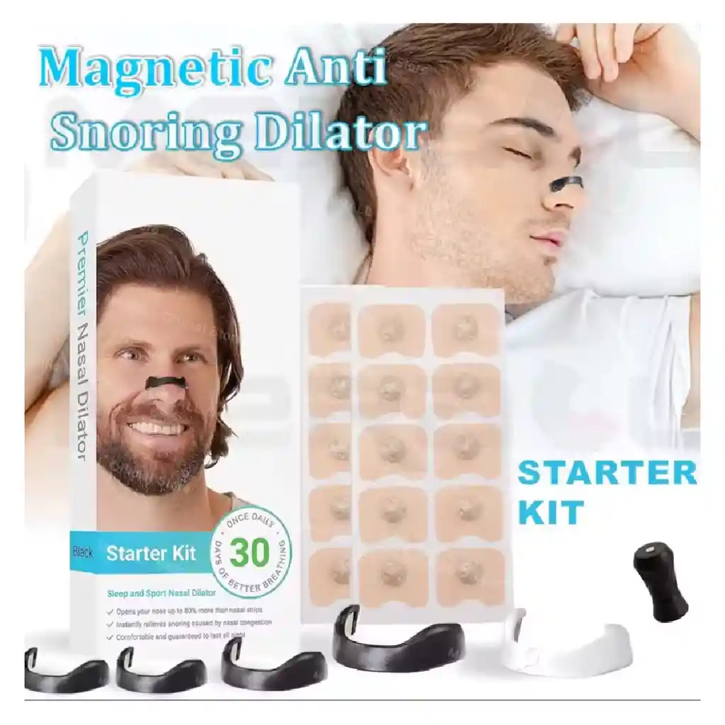 Kit 30 Dilatadores Nasales Antironquidos con Imán Mejora tu calidad de sueño con este completo kit de 30 dilatadores nasales magnéticos reutilizables. Diseñados para abrir suavemente las fosas nasales, permiten una mejor entrada de aire, reduciendo significativamente los ronquidos y mejorando la respiración durante la noche. Caracteristicas principales Funcion magnetica: cada dilatador cuenta con pequeños imanes que estimulan puntos clave para una mejor respiracion nasal. Diseno ergonomico: se adapta comodamente a la forma de la nariz sin causar molestias. Material seguro: fabricados en silicona suave de grado medico, hipoalergenica y libre de BPA. Reutilizable e higienico: faciles de lavar y almacenar, ideales para uso diario. Uso versatil: recomendados para dormir mejor, aliviar congestiones y mejorar el rendimiento deportivo. Contenido del paquete 30 dilatadores nasales magneticos reutilizables Estuche de almacenamiento portatil Beneficios Reduce ronquidos y mejora la respiracion nocturna Ayuda a mantener las vias respiratorias abiertas sin medicamentos Apto para hombres y mujeres