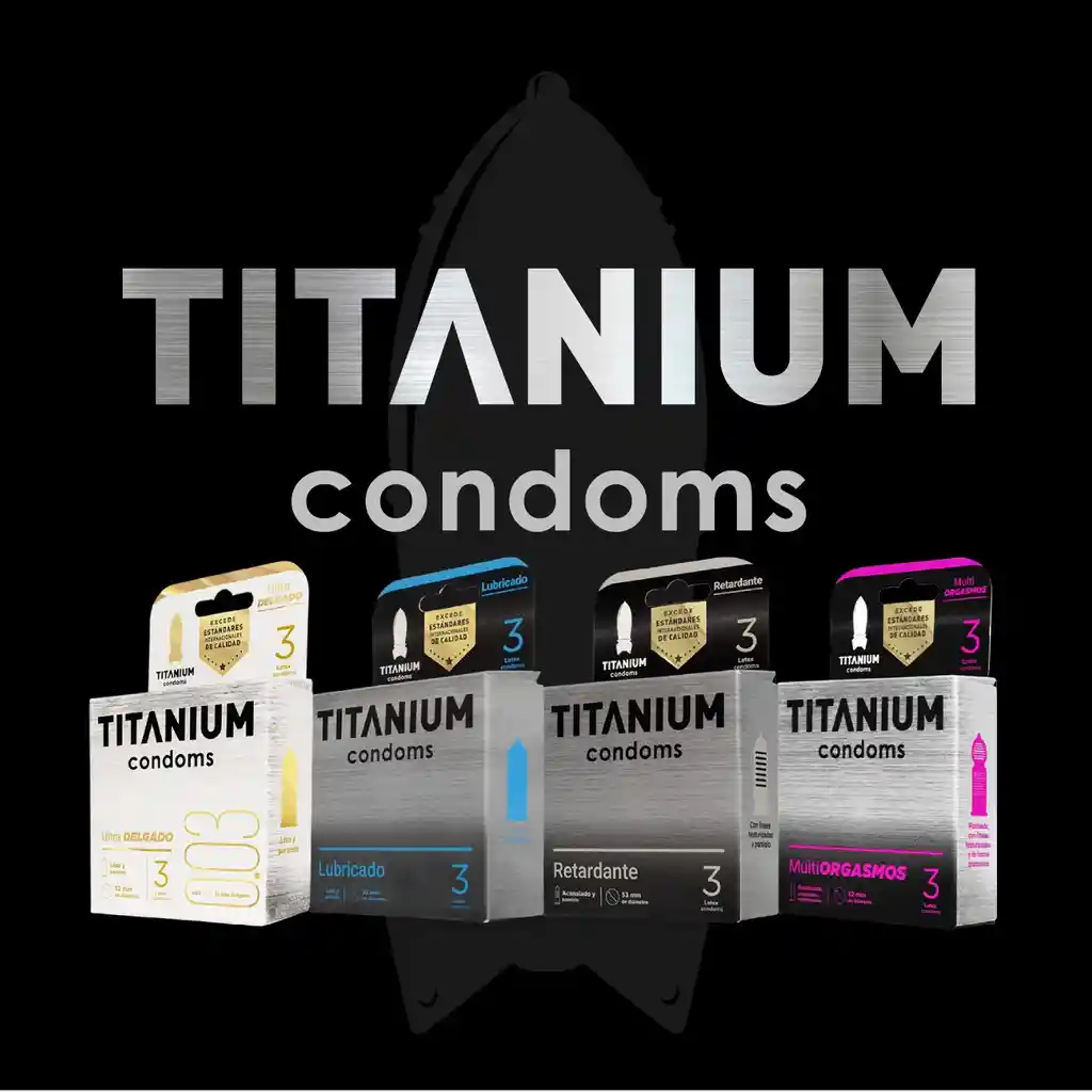 Incluye: - 3 Condones Lubricados - 3 Condones Retardantes - 3 Condones Multiorgasmos - 3 Condones Ultra Delgados Los Condones Titanium están elaborados con la mejor tecnología y en los mejores procesos de fabricación, lo que permite que su durabilidad, protección y seguridad excedan los estándares internacionales de calidad. Características del Condones Titanium Lubricado x 3 Fabricado con látex premium Lubricado con silicona premium Electrónicamente testeado Posee depósito de fluidos en la punta Presentación: 3 unidades Textura: lisa Forma: paralela Medidas: Ancho: 53 mm Espesor: 0.06 - 0.09 mm INVIMA: 2021DM-0022827