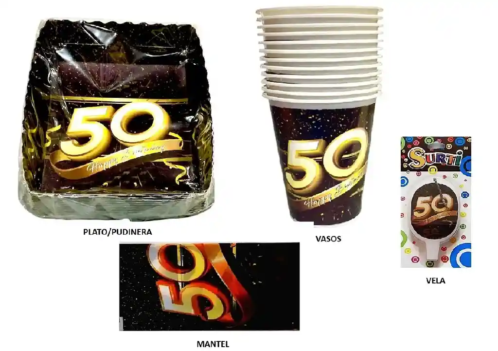 Kit 50 años. Contiene Plato Para Torta / Pudin 50 Años X 12 Unidades, Vaso Desechable Plastico 50 Años 6 Oz X 12 Und, Mantel Plastico Para Fiesta 50 Años y una Vela 50 Años 8 X 5 Cm