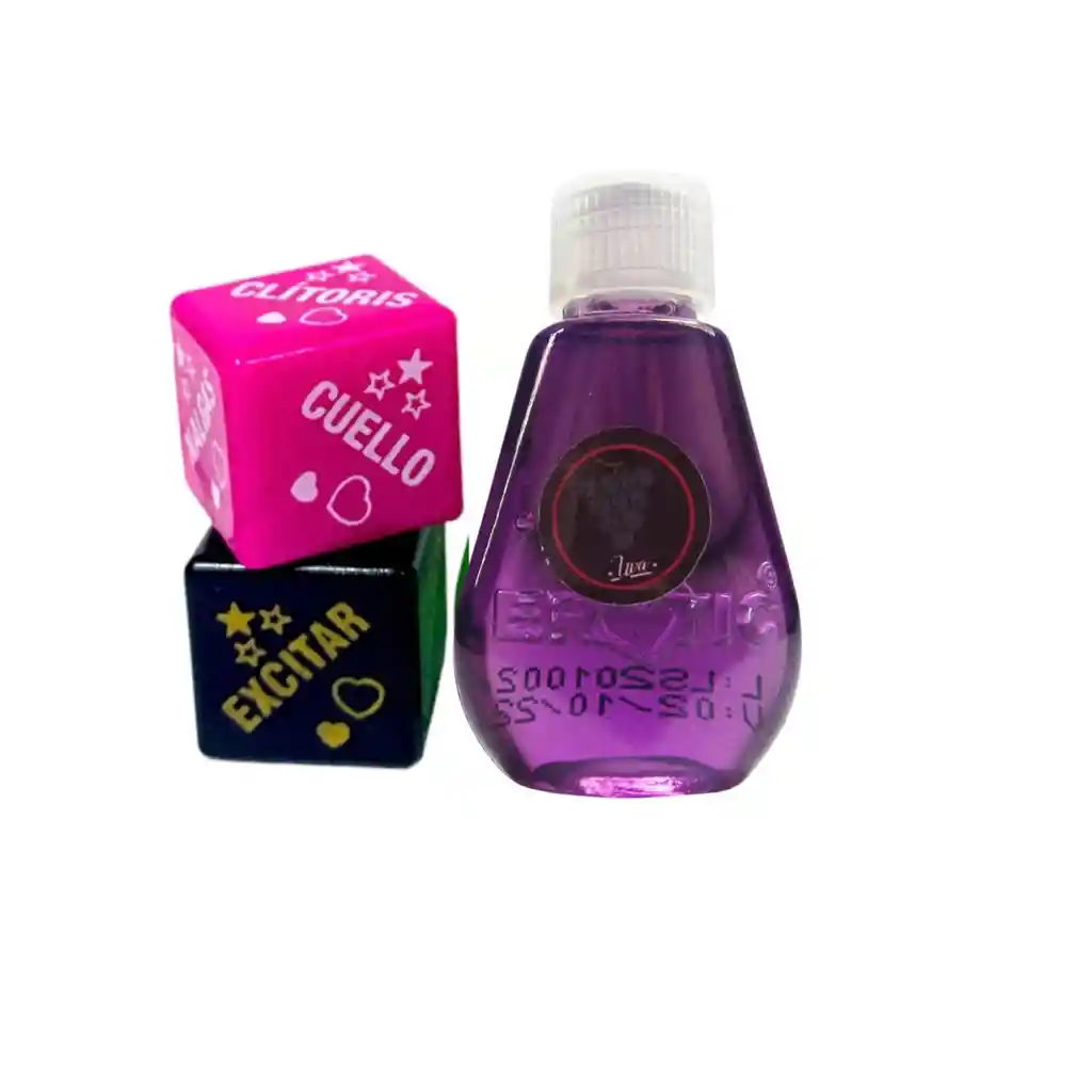 Kit Aceite Lubricante + Dados Sabor Uva Características: Con sabores surtidos a base de aceite Contenido: 13ml Incluye un par de dados Lubricante caliente y comestible, para disfrutar de relaciones más intensas acompañadas de masajes eróticos en la zona intima.Los lubricantes calientes son una invitación a un encuentro sexual divertido, un juego preliminar para experimentar momentos más placenteros y saborizados, al igual que los dados son una perfecta combinación para la diversión, intenta solo lanzar los dados y poner a prueba lo que te indiquen ¡Ya lo demás es parte de tu imaginación!