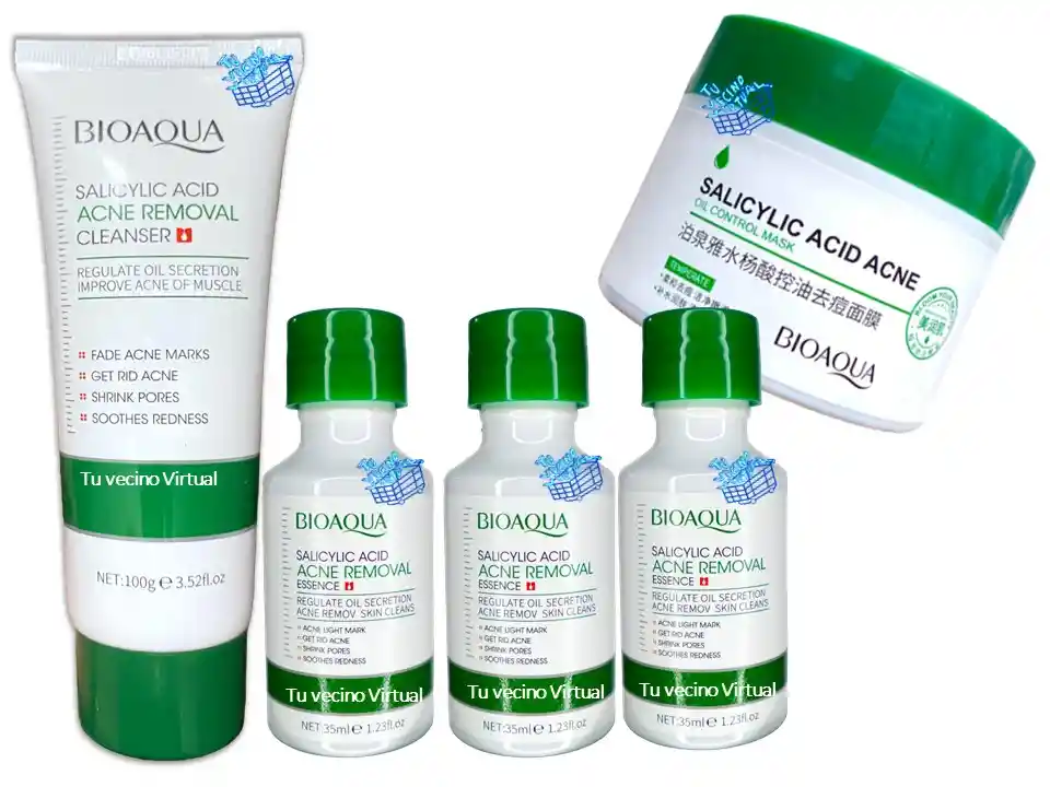 En tu vecino virtual también encontraras : Anyeluz, syam cosmetic, piel de oro, Kaba, class gold, lampiña, Te verde de matcha Benefit, te plus, te latte, te negro, exfoliante, aceite de coco, pomada alfa, colageno hidrolizado,vinipel osmótico, Bioaqua Acne, Mascarillas,tónico, Trendy, la pocion, HGW y muchos mas ————————————————————————————————————————————————— Essence de ácido salicílico BioQUA (previene e hidrata) El suero de ácido salicílico ayuda a reducir el acné mientras hidrata la piel, es fácil de absorber, repara y reduce los poros grandes ayudando a suavizar la piel, tiene una excelente capacidad para penetrar y reducir la pigmentación de la piel sin obstruir los poros. Suaviza la piel del rostro. Elimina las espinillas, nutre eficazmente la piel, inyecta humedad y diluye las cicatrices. Libre de parabenos. Apta para todo tipo de piel Modo de uso: Después de realizar la limpieza del rostro, tome una cantidad adecuada de este producto, extiéndalo de manera uniforme en el rostro y masajee hasta que se absorba, retíralo al otro día con abundante agua, aplicarlo en la noche Contenido: 35 ml ___________________________________________________________ Jabon Facial Acido Salicilico Todo Tipo De Piel LIMPIADOR ELIMINADOR DE ACNE CON ÁCIDO SALICÍLICO Especialmente diseñada para los músculos del acné, la espuma es rica, densa y delicada, limpia profundamente los músculos, refresca y controla la grasa, elimina fácilmente la suciedad de la piel y los residuos de maquillaje diario, limpia los poros, contiene ácido salicílico y deja la piel suave. Modo de uso: Después de que la piel esté mojada, tome una cantidad apropiada de este producto y agregue agua para crear una espuma, masajee suavemente en la cara con movimientos circulares por un tiempo, luego enjuague con agua Contenido: 100g INVIMA: NSOC08969-21CO ________________________________________________________ Crema Antiacné de ácido Salicílico Bioaqua Crema Antiacné de ácido Salicílico Bioaqua: Contiene ácido salicílico. Su acción está dirigida a la cicatrización y restauración profundas de la piel. Es adecuada para el cuidado complejo de la piel con acné y poros dilatados. Cura el enrojecimiento y elimina las erupciones. Evita la reaparición de la inflamación. Normaliza la producción de sebo. Activa la renovación de la piel. Reduce visiblemente los poros dilatados. Mejora el micro relieve de la piel, suaviza y unifica el tono general, iluminando suavemente el post-acné. La textura ligera similar a un gel permite que la crema se absorba rápidamente sin dejar una sensación pegajosa y grasosa en la superficie de la piel y no obstruye los poros. Modo de uso: Después de limpiar la piel, tome la cantidad adecuada de producto. Aplicar la crema sobre el rostro y masajear hasta su total absorción. 120g