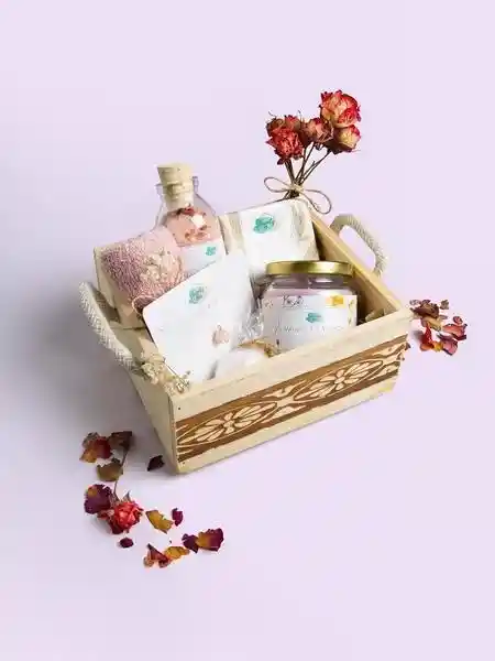 Vela aromática jabón de glicerina bomba efervescente sal marina de rosas, collar con gema cuarzo y toalla facial. Caja madera