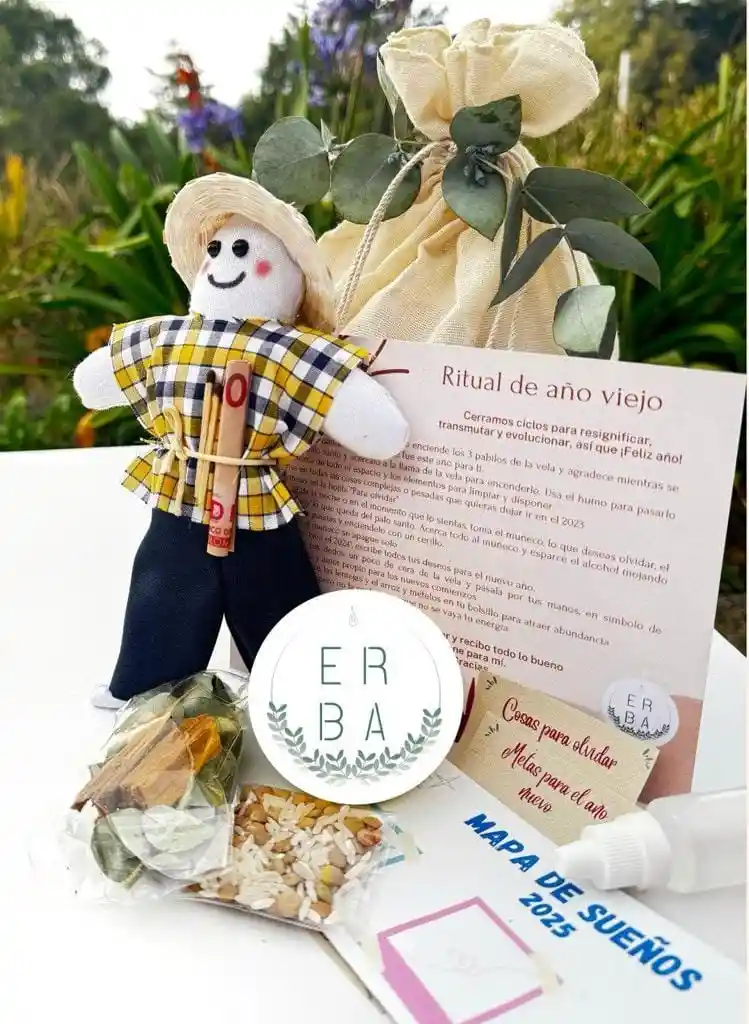 Ritual de año viejo sencillo Con este ritual cerramos ciclos para resignificar, renovar la energía y evolucionar hacia los nuevos propósitos. Contiene: - Muñeco de año viejo - 3 cerillos y alcohol - Lentejas y Arroz - Billete simbólico - Eucalipto - Palo santo - Tarjeta de instrucciones paso a paso para el ritual