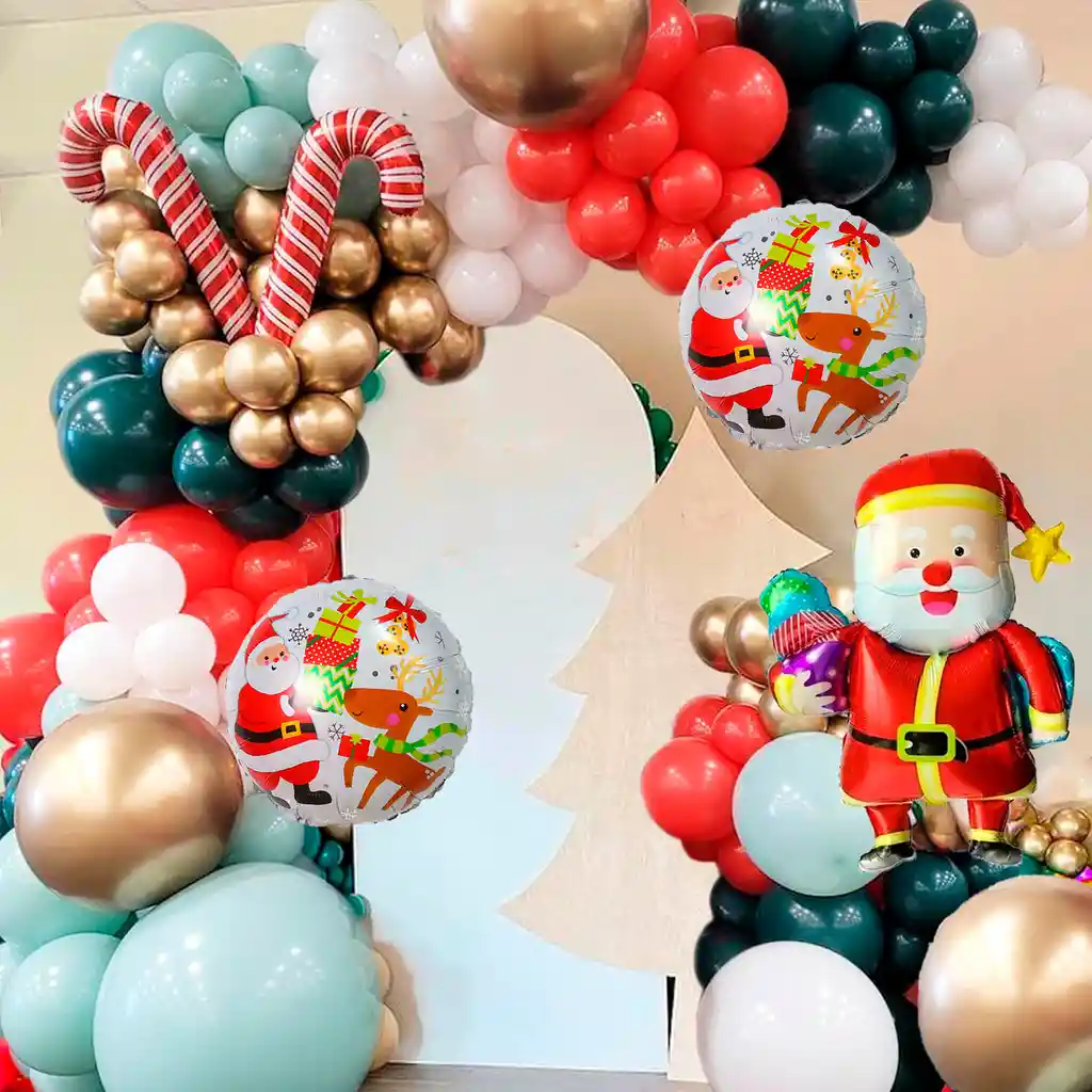 *********************GLOBOS Y PELUCHES MASMELO********************* ————————-Somos Mercado Líder Platinum———————— Te damos toda la asesoría para que tú puedas armar tu propio arco Por tu compra te llevas: 1 Globo PAPÁ Noel 65*45cms 2 Globos bastón 70*30cms 2 Globos circular de feliz navidad 45*45cms 1 Globo verde pastel R18 45cms 10 Globos verde pastel R12 30cms 4 Globo verde pastel R5 13cms 20 Globo verde esmeralda R12 30cms 15 Globo rojo R12 30cms 20 Globo rojo R5 13cm 3 Globo dorado cromado R18 50cms 5 Globo dorado cromado R12 30cms 30 Globos dorado cromado R5 13cms 1 Globo blanco R18 45cms 12 Globos blanco R12 30cms 30 Globos blanco R5 13cms Total 156 globos 1 Cinta de arco 5 metros 1 Pegatina 100 puntos adhesivos *No incluye fondo decorativo no está disponible. * Los globos se entregan desinflados, tu compra no incluye el montaje ni la decoración, el servicio de armado no lo tenemos disponible. sin embargo te damos todas las instrucciones para hacer de modo profesional. Si deseas adicionar otros artículos a tu compra puedes escribirnos, recuerda que Somos Globos y Peluches Masmelo Si necesitas variación en los colores, colocar un número, más globos o realizar otros cambios en el diseño original escríbenos para ver si podemos hacerlo. Tenemos todo lo necesario para tus decoraciones, somos lo último en tendencias mundiales decorativas. Tenemos disponible: Vasos, platos, manteles, guirnaldas, cubiertos, globos de todo tipo, números, letreros, vela, Etc. Puedes encontrar los artículos de nuestra tienda en el siguiente link, copia y pega, si no encuentras lo que necesitas escríbenos: https://www.rappi.com.co/tiendas/900280040-globosypeluchesmasmelo-mt-enc/decoracion-para-fiestas/globos-y-bombas