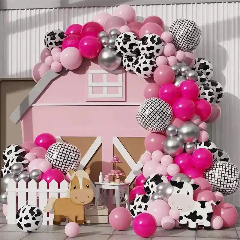 *********************GLOBOS Y PELUCHES MASMELO********************* Por tu compra Llevas: 4 Globo orbit 55 cm fiesta disco 16 Globo manchas de vaca 30cm 10 Globo plateado cromado 30cm 10 Globo plateado cromado 13 cm 15 Globo palo de rosa 30cm 35 Globo rosado 30cm 20 Globo rosado 13cm 20 Globo fucsia 30cm 1 cinta de arco 5 metros 1 Cinta 100 puntos adhesivos *Los globos se entregan desinflados, tu compra no incluye el montaje ni la decoración, el servicio de armado no lo tenemos disponible. sin embargo te damos todas las instrucciones para hacer de modo profesional. Si deseas adicionar otros articulos a tu compra puedes escribirnos, recuerda que Somos Globos y Peluches Masmelo Si necesitas variación en los colores, colocar un número, más globos o realizar otros cambios en el diseño original escribenos para ver si podemos hacerlo. Tenemos todo lo necesario para tus decoraciones, somos lo último en tendencias mundiales decorativas. Tenemos disponible: Vasos, platos, manteles, guirnaldas, cubiertos, globos de todo tipo, números, letreros, vela, Etc. Puedes encontrar los articulos de nuestra tienda en el siguiente link, copia y pega, si no encuentas lo que necesitas escribenos: https://www.rappi.com.co/tiendas/900280040-globosypeluchesmasmelo-mt-enc/decoracion-para-fiestas/globos-y-bombas – En Bogotá despachamos para el mismo día, si haces el pedido antes de las 2PM (no incluye festivos)