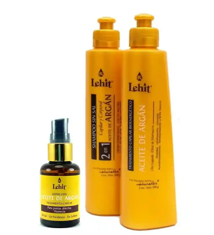 KIT ARGAN: SHAMPOO + TRATAMIENTO + ACEITE Contiene: - Shampoo sin sal argan 300ml - Tratamiento argan 300ml - Aceite argan 60ml TERMOPROTECCION-BRILLO Oro líquido de Marruecos Su alta estabilidad permite conservar sus cualidades regeneradoras, hidratantes y nutritivas. Favorece el crecimiento del cabello al activar los procesos de regeneración celular y acelerar sus ciclos. Poderoso antioxidante, protector y desintoxicante, además de regulador y equilibrante de la secreción sebácea. Recupera la salud de la fibra, resistencia, flexibilidad, suavidad y brillo natural. Recomendado especialmente para cabellos secos y extremadamente maltratados por sometimiento a procesos de decoloración o alisado.