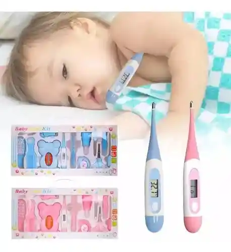 Cantidad de piezas: 13 Incluye cepillo para cabello: Sí 1 Kit de aseo recién nacido El mas completo kit que podemos tener en nuestras casas para atender a nuestros bebes contiene 13 piezas Incluye: 1. Cepillo para el cabello de cerdas suaves 2. Peinilla para el cabello 3. Extractor pera nasal con punta de silicona blanda 4. Gotero medidor para medicinas 5. Termómetro digital con punta flexible 6. termómetro para medir la temperatura del agua. 7.Cepillo bucal en forma de dedo. 8. cepillo de dientes en goma para masajes 9. Corta uñas para bebe 10. Tijeras con punta redonda para las uñas 11. Lima especial para uñitas delicadas 12. Color disponible en rosado y azul. 13. chupo con tapa