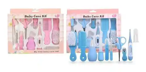 Kit para bebe de 10 piezas Incluye: Cepillo para el cabello de cerdas suaves Peinilla para el cabello Extractor nasal con punta de silicona blanda Gotero medidor para medicinas Termómetro digital con punta flexible Cepillo bucal para utilizar con dedo en silicona con masajeador Cortaúñas para bebe Tijeras con punta redonda para las uñas Lima especial para uñitas delicadas .