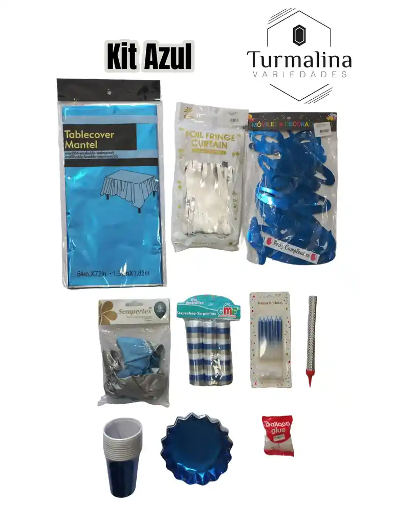 Este Kit para fiestas es ideal para decorar su celebración especial y contiene los siguientes elementos: 1 Mantel Metálico Azul 1 Letrero Feliz Cumpleaños Letra Cursiva Azul 1 Cortina Plateada 1 Serpentina azul, plateado, blanca 1 Paquete de Velas Cortas Azul y Blanco X6 unidades 1 Paquete de Bombas Serpentex R12 X12 Réflex Marcadas Feliz Cumpleaños color Azul y blanco 1 Set de Vaso para fiesta X12 Color Azul 1 Set de Tortero para Fiesta X12 Color Azul 1 Vela Volcán plateada 1 Cinta Punto China Silicona Para Decorar ¡Disfrute de su celebración con Variedades Turmalina!